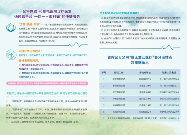 上海郵政普陀區(qū)分公司工會(huì)于2020年7月和郵電醫(yī)院對(duì)接,在分公司職工之家設(shè)立了云醫(yī)療服務(wù)點(diǎn)。一年來(lái),通過(guò)遠(yuǎn)程云醫(yī)療服務(wù)為員工提供在線問(wèn)診及配藥品約210人次,極大地方便了員工問(wèn)診購(gòu)藥。