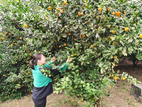 采摘活動中,員工們三人一群,兩人一伙的聚在一棵棵橘子樹下,或彎腰、或踮腳,滿足的收獲著春日種下的果實。