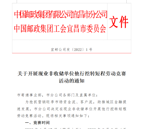 為搶抓營銷旺季市場資金流、客戶流,助推城區金融提速發展,宜昌郵政決定于2022年1月17日(臘月十五)—2022年3月2日(正月三十)期間,組織現業非收儲單位的全體工會會員及勞動派遣公司托管會員開展“他行挖轉”專項短程勞動競賽活動。