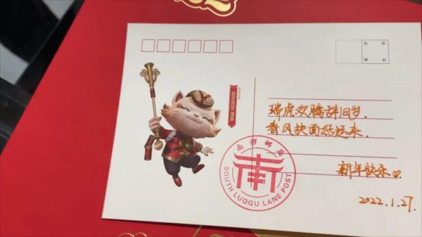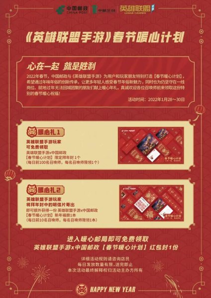 2022年,中國郵政與《英雄聯盟手游》攜手,共同打造春節暖心計劃,希望通過年味年俗的創新傳承,為那些支持疫情工作就地過年的年輕人,堅守在疫情防護前線無法回城團聚的職工,獻上一份暖心的新年問候,提供一份貼心的陪伴。 作為北京唯一指定活動地點——南鑼主題郵局也華麗變裝“暖心郵局”。