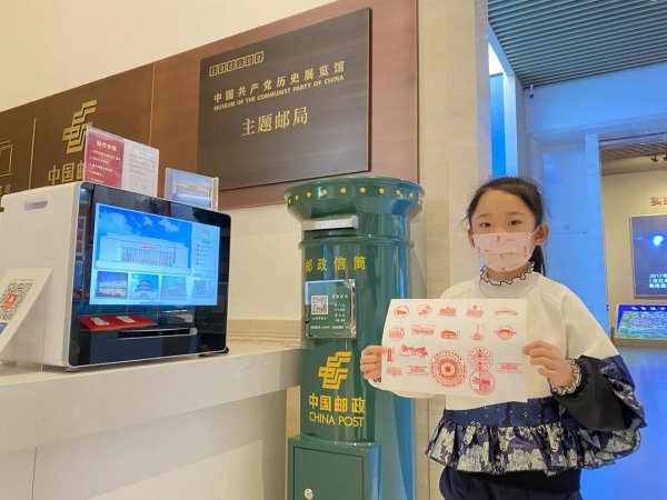 在蓋戳服務處,一共17個黨史主題的郵戳戳中了觀眾的需求點。9歲的潘韻茜小朋友從書包里掏出提前準備好的A4紙,工工整整地將每一個紀念戳蓋在上面。潘韻茜的媽媽告訴記者:“很小的時候,我女兒就對郵票、明信片感興趣,每次出門明信片必買、郵戳必蓋。”潘韻茜在媽媽的陪伴下,選購了不少黨史主題郵品。她說:“回家了,我還想對著這些郵戳和明信片,再溫習一下看過的展覽。”