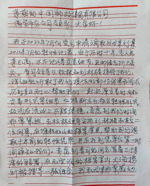 事情的緣由是這樣的:客戶謝白羽由于官司原因,于2022年7月向高安市分公司申請調取其母親劉某2012年7月的轉賬記錄。由于歷時10年,老人家已年邁九十,不記得當時的交易細節,且郵儲存折已丟失。高安市分公司副總經理王松林得知后,第一時間安排金融業務部中間業務管理兼風控檢查員劉林駿予以接待配合。在詳細聽取了謝白羽提供的部分線索以及訴求后,劉林駿通過日常工作經驗以及網點辦理業務流程推斷,客戶可能是以柜面轉賬的形式進行的交易,那么就必須找到當時的轉賬交易憑證。雖然這只是可能,但是劉林駿沒有放棄任何一線希望,在安撫客戶焦急的情緒讓客戶安心回家等待后,每天在堆積如山的檔案室中,幫客戶翻閱資料。正值這酷暑高溫天氣,加上檔案室里沒有空調,劉林駿就像大海撈針一樣搜尋相關憑證資料,每次回到辦公室都是一身大汗淋漓。在這樣炎熱的天氣,他整整翻了三天,每天都是如此,終于功夫不負有心人,最終找到了客戶的交易憑證,并第一時間聯系了謝白羽。