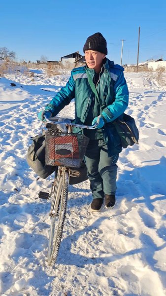 他就是中國郵政集團(tuán)有限公司黑龍江省呼瑪縣分公司北疆支局鄉(xiāng)郵員韓幫緒,1989年9月他進(jìn)入北疆鄉(xiāng)郵電所工作,從此開始了他的綠衣使者生涯,1998年郵電分營后,原來的郵電所變成了郵政支局,他一個(gè)人、一條路、一個(gè)支局在這里一干就是三十幾年。由于北疆鄉(xiāng)地處山區(qū),道路崎嶇,投遞線路長,投遞累計(jì)總長度達(dá)120多公里,經(jīng)常是早上騎車出門,到了傍晚才回家。餓了,就著咸菜嚼口干糧;渴了,在河邊舀瓢涼水喝。夏天,天氣酷熱難耐,遇到下雨天,道路泥濘,為了不淋濕郵袋里的信件,他就用塑料布把郵袋包好,自己被雨淋濕,感冒發(fā)燒是常有的事。一次他騎自行車投遞時(shí)不小心摔傷,頭上縫了5針,簡單處理了傷口就又繼續(xù)工作,現(xiàn)在頭上還留著一塊傷疤。冬天,這里最低氣溫達(dá)到零下40度以上,寒風(fēng)打在臉上像刀子割一樣,雪大路滑,沒法騎自行車,只能推著自行車投遞,每次回家,身上都會上一層霜。就是在這樣艱苦的環(huán)境下,他沒有一句怨言,他始終告訴自己,一定要將郵件準(zhǔn)確送到每個(gè)用戶手中,因?yàn)閷τ卩l(xiāng)親們來說,這不僅僅是一個(gè)包裹、一份報(bào)紙,更是他們與外界連接的橋梁。三十三年的投遞生涯,他已經(jīng)把這份工作當(dāng)成自己生命中不可缺少的一部分,三十三年的青春年華,已經(jīng)全部獻(xiàn)給了郵政事業(yè),三十三年的跋涉與堅(jiān)守,換來的是大家對他的那份信任與期盼。
