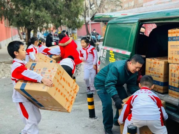 12月22日,當(dāng)人大附中實(shí)驗(yàn)小學(xué)的老師得知中國(guó)郵政開(kāi)通免費(fèi)寄遞綠色通道后,第一時(shí)間與長(zhǎng)期合作的海淀郵政中關(guān)村營(yíng)業(yè)部的攬投員史春華聯(lián)系,表示要捐贈(zèng)一批棉衣、羽絨服、被子等物資。按照約定時(shí)間,25日中午,史春華和同事們準(zhǔn)時(shí)來(lái)到學(xué)校。通過(guò)兩天的募集,一年級(jí)的學(xué)生捐贈(zèng)的物資摞成了小山。在老師的幫助下,不到1個(gè)小時(shí),1000余件捐贈(zèng)物資,共計(jì)72箱全部打包裝車(chē)完畢。同時(shí),每個(gè)箱子上貼有營(yíng)業(yè)部為志愿團(tuán)隊(duì)特別定制的專屬標(biāo)簽。