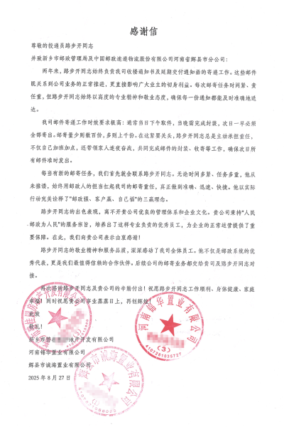 在感謝信中,碧盈房產還表示,路步開同志的出色表現,離不開郵政優良的管理體系和企業文化。郵政秉持"人民郵政為人民"的服務宗旨,才培養出了專業負責的優秀員工,為客戶企業的正常運營提供了重要保障。(河南省郵政工會)