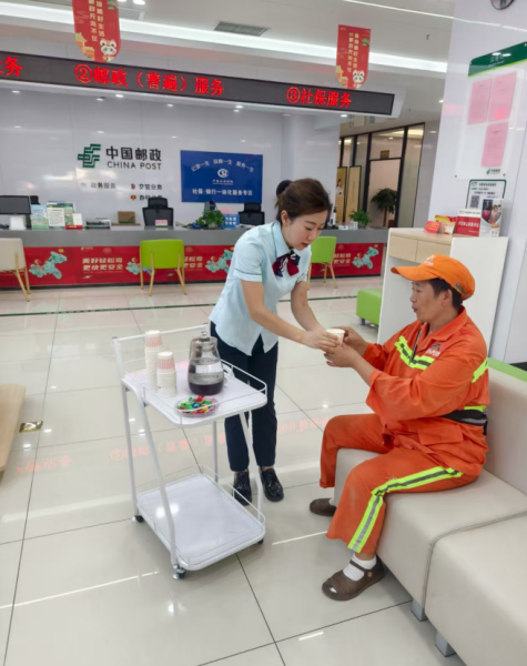 活動中,郵政工作人員親手將一瓶瓶冰鎮飲料遞到環衛工人手中,并真誠地道一聲“辛苦了”。一位剛結束早班清掃的阿姨感動地說:“能有個地方坐一坐、喝口水,心里特別暖。”這不僅僅是一杯水的關懷,更是一份對平凡崗位偉大奉獻的尊重與認可。