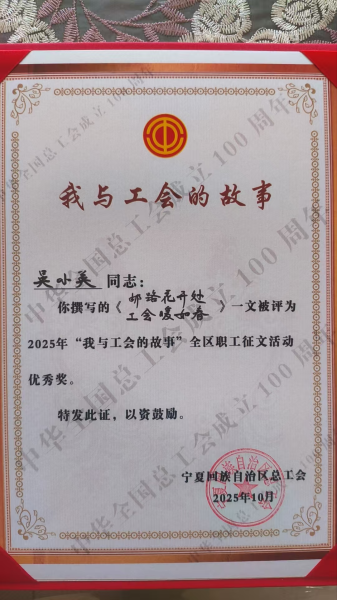 近日,寧夏回族自治區總工會“我與工會的故事”全區職工征文活動評選結果揭曉,銀川郵政工會選送的職工吳小英憑借真摯動人的作品榮獲優秀獎。