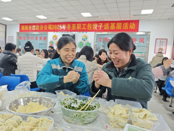 12月19日(星期五)下午3時,市分公司本部及臥龍、宛城兩區的員工代表齊聚一堂、親手包制餃子,在協作互動中體驗傳統飲食文化的樂趣,分享勞動與創造的喜悅。為共享節慶氛圍,市分公司還分別把餃子送往市區各基層網點和攬投部,讓奮戰在一線、無法親臨活動現場的員工也能在冬至時節吃上熱氣騰騰的餃子,切實傳遞市分公司黨委和工會組織對基層職工的掛念與關愛。