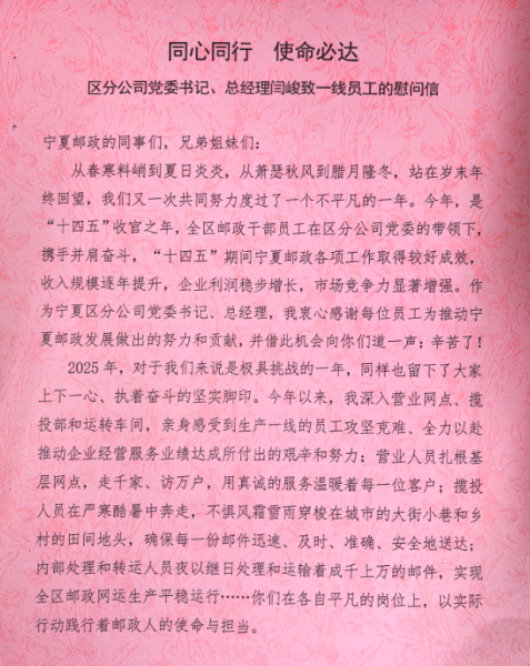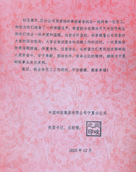時(shí)至寒冬,氣溫驟降,區(qū)分公司黨委始終堅(jiān)持以人民為中心的發(fā)展理念,時(shí)刻牽掛著奮戰(zhàn)在服務(wù)一線的郵政員工。為切實(shí)保障一線員工在嚴(yán)寒天氣下工作舒適與身體健康,讓大家暖心上崗、安心履職,區(qū)分公司黨委書記、總經(jīng)理閆峻提前部署、親自指導(dǎo),責(zé)成區(qū)分公司機(jī)關(guān)工會(huì)遴選采購(gòu)了一批保暖性能優(yōu)良、穿著便捷實(shí)用的保暖馬甲,與一封帶著深深關(guān)切和殷殷囑托的慰問(wèn)信一同送到了基層一線員工的手中。區(qū)分公司黨委希望大家在做好生產(chǎn)經(jīng)營(yíng)、服務(wù)保障工作的同時(shí),做好防寒保暖措施,保重身體,注意安全,也希望廣大干部員工更好地發(fā)揮郵政人艱苦奮斗、甘于奉獻(xiàn)、團(tuán)結(jié)協(xié)作、使命必達(dá)的精神,為寧夏郵政事業(yè)發(fā)光發(fā)熱。