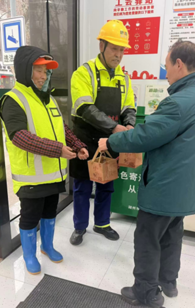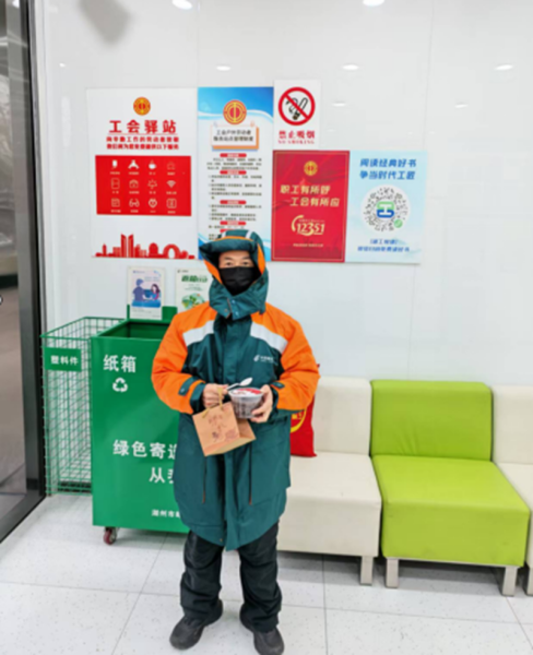 臘八節當天,湖州市郵政工會在湖州市總工會支持下,依托“郵愛驛站”開展“臘八送暖·郵愛同行”公益活動,為環衛工人、快遞外賣小哥等城市“小蜜蜂”送上熱粥和新年福字包。