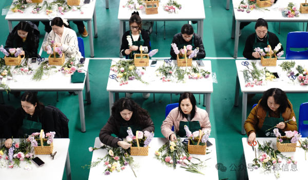 花藝創作區域則是另一番雅致景象,專業花藝師現場授課,從花材選擇、色彩搭配到造型設計、修剪技巧,都進行了細致講解和耐心指導。女職工們化身“花藝師”,手持鮮花專注創作,在修剪、搭配、插制的過程中,充分發揮想象力與創造力。玫瑰嬌艷、康乃馨溫婉、洋甘菊清新,經過大家的巧手裝扮,一束束錯落有致、生機盎然的花藝作品新鮮“出爐”。現場花香四溢,與包元宵區域的歡聲笑語交織在一起,構成了一幅溫馨和諧、兼具煙火氣與雅致感的郵政職工團圓畫卷。