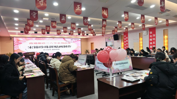 3月6日下午,宋錦珍珠拼貼畫制作活動率先拉開帷幕,60多名女職工齊聚一堂,開啟了一場兼具美感、治愈感與手工樂趣的非遺體驗之旅。宋錦,作為中國“四大名錦”之一,其紋樣精致、色彩典雅,承載著千年非遺的深厚底蘊;珍珠的瑩潤光澤與宋錦的雅致紋理交相輝映,碰撞出獨特的藝術火花。女職工們從設計構圖開始,小心翼翼地用鑷子將一顆顆小巧的珍珠,依循畫稿黏合在精美的宋錦底布上,整個過程寧靜而溫馨,大家相互交流技巧、彼此鼓勵打氣,在專注創作中釋放工作壓力。歷經兩個多小時的精心雕琢,一幅幅獨具匠心的宋錦珍珠拼貼畫漸次成型,每一幅作品皆傾注了女職工的巧思與心血,不僅讓大家領略到傳統非遺工藝的獨特魅力,更在親自動手實踐中收獲了滿滿的成就感與幸福感,陶冶了情操,愉悅了身心。