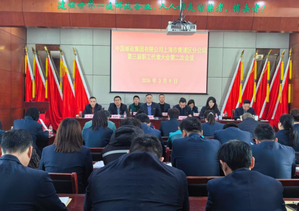 2026年3月9日,中國郵政集團有限公司上海市青浦區分公司第三屆職工代表大會第二次會議召開。本次大會以全面貫徹落實黨的二十大、黨的二十屆歷次全會精神,認真落實以職工代表大會為基本形式的企業民主管理制度,總結2025年工作,部署2026年任務。團結動員廣大郵政干部職工,為開創青浦郵政高質量發展而努力奮斗。