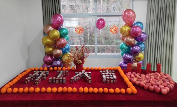 儀式現(xiàn)場(chǎng)布置精心、氛圍熱烈,氣球裝點(diǎn)、年味濃郁。創(chuàng)意擺臺(tái)寓意美好:旺仔牛奶罐堆疊成 “開工大吉” 字樣,蘋果、桔子擺放成愛心造型,傳遞平安吉祥、團(tuán)結(jié)奮進(jìn)的美好祝愿。