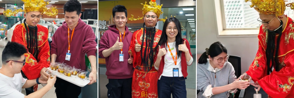 暖心茶點派送環節,“雙buff”驚喜陣容重磅登場。身著紅袍、頭戴金冠的“財神爺”穿梭在各個工位,一邊為員工送上香甜可口的春日茶點,一邊送上美好祝福,同事們驚喜不已,紛紛領取茶點、爭相與“財神爺”合影,朋友圈瞬間被這場“接福送暖”的驚喜刷屏;中心骨干代表兵分多路,走進各辦公區域、一線工位,為員工親手送上暖心茶點,讓忙碌的工位瞬間升溫,處處涌動著家一般的溫情。